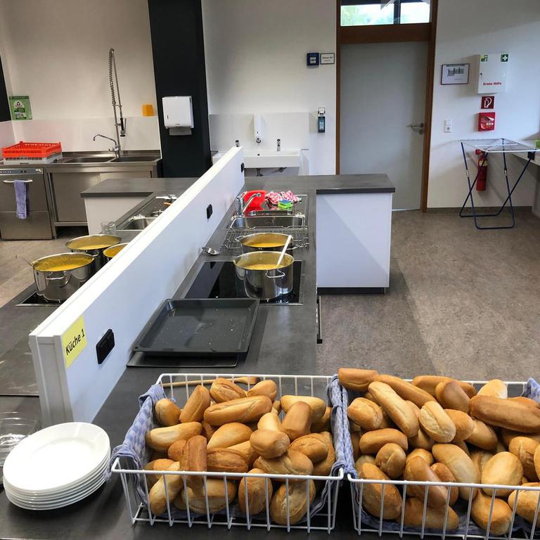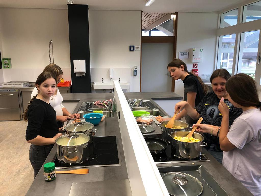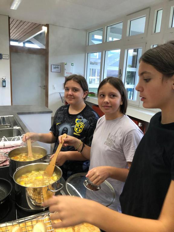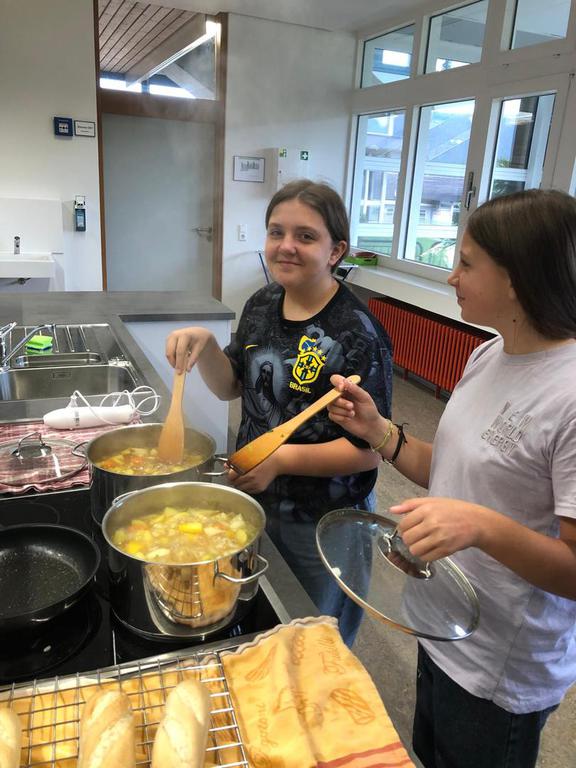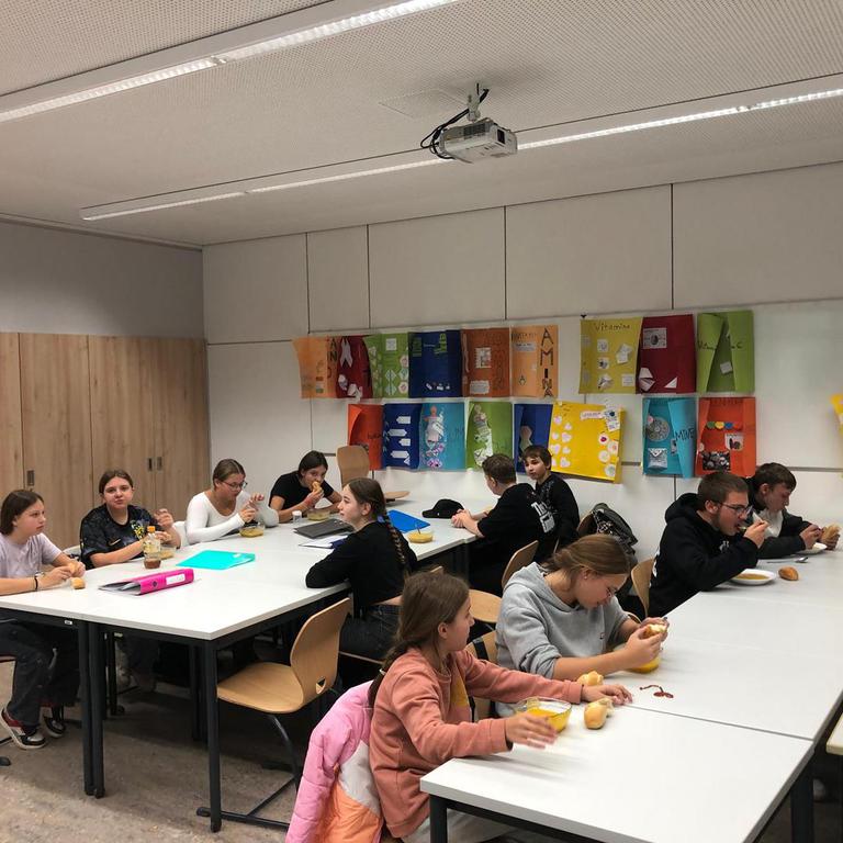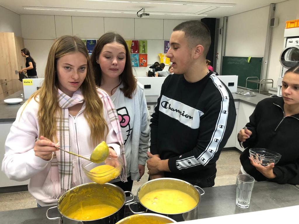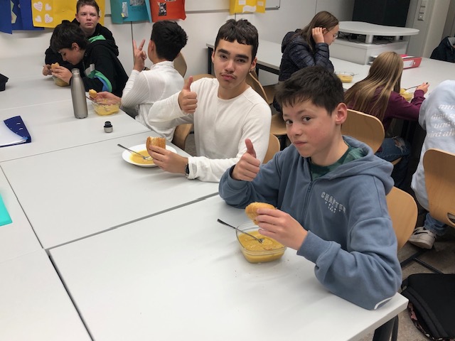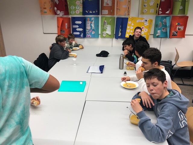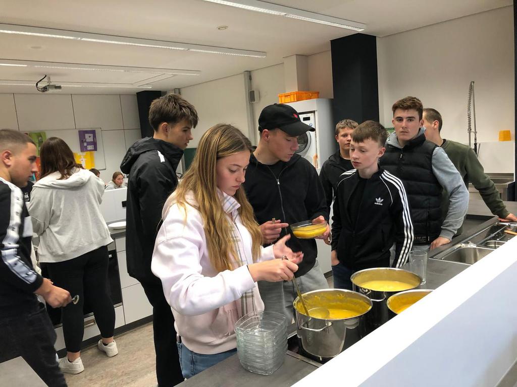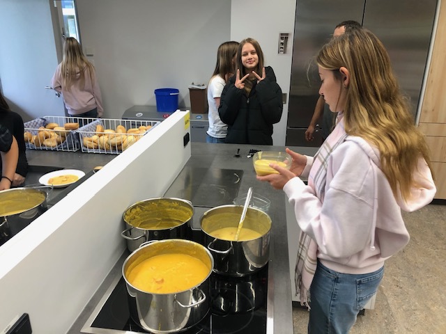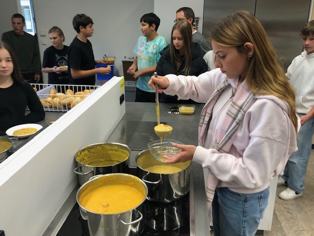 In der Mittagspause waren alle Schülerinnen und Schüler zu einer Kürbissuppe eingeladen. Die Suppe wurde von den AES-Gruppen der Klassen 6 und 7 gekocht, die Zutaten dazu stammten zum größten Teil aus unserem eigenen Schulgarten.