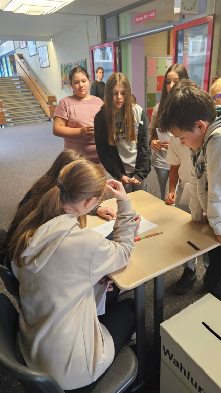Höhepunkt war nun heute die "Juniorwahl" für die Klassenstufen 8/9. Hier konnten alle Schülerinnen und Schüler, die ins Wählerverzeichnis - sprich die Klassenliste - eingetragen sind, ihre Stimme abgeben.