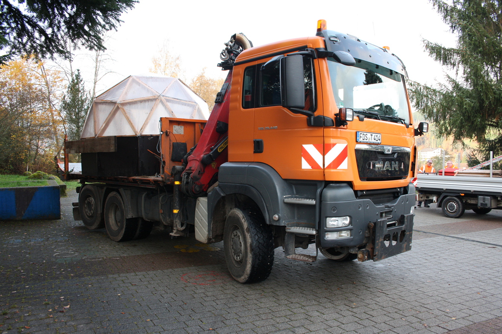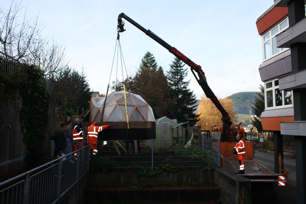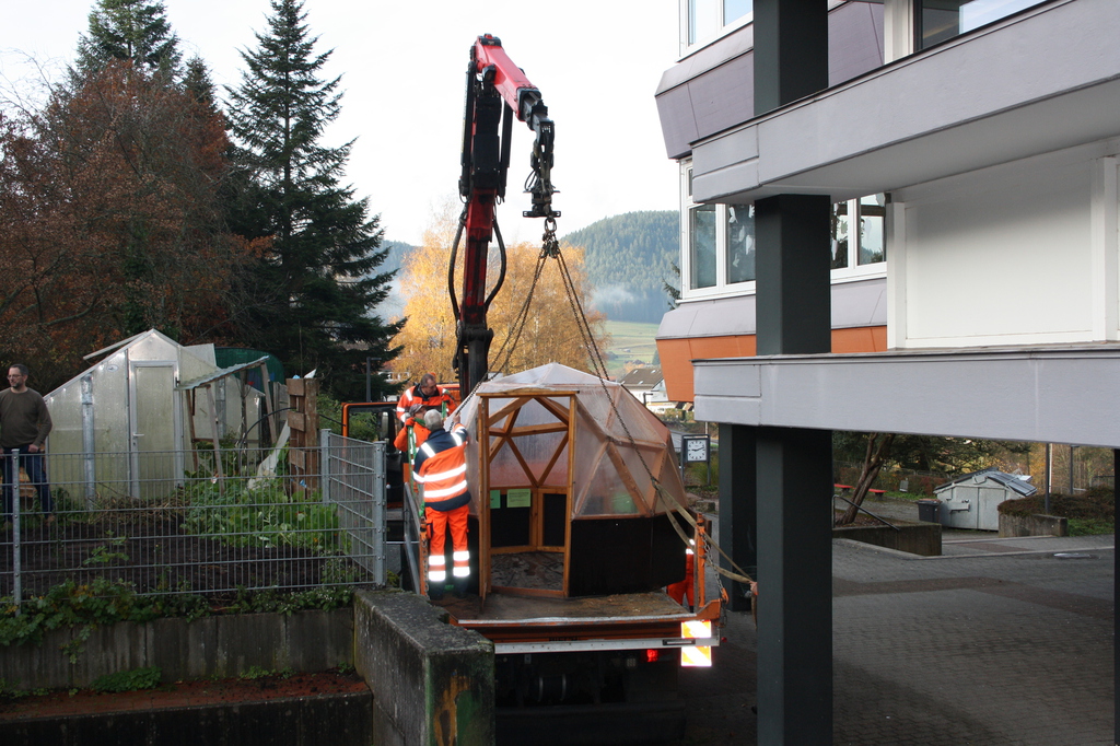 (11.11.2025) Fast ein halbes Jahr lang stand unser Geodome auf dem Gartenschaugelände und begeisterte dort eine Vielzahl von Besuchern. Das Gewächshaus, das in langer und aufwändiger Planungs- und Bauarbeit erstellt wurde, kehrte nun heute wieder zurück ans Schulzentrum.