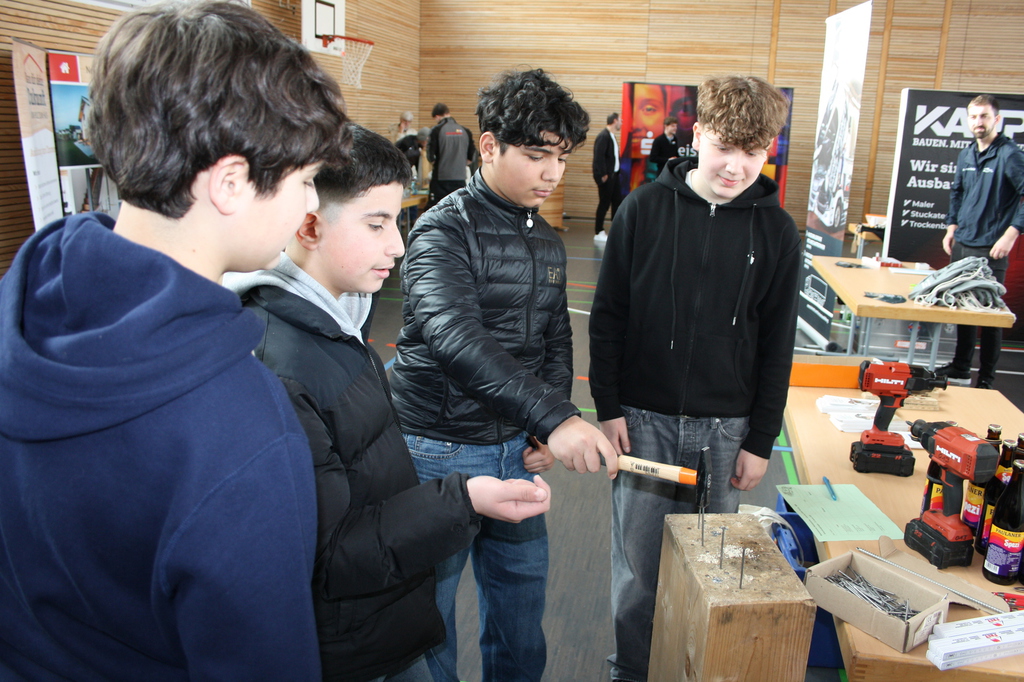 Und so präsentierten sich auf der traditionellen Veranstaltung in der neuen Sporthalle 26 Firmen und Unternehmen ausnahmslos aus dem Gemeindegebiet. Sie stellten den Schülerinnen und Schülern der Klassen 7-9 ihre Betriebe und die angebotenen Ausbildungsberufe vor.