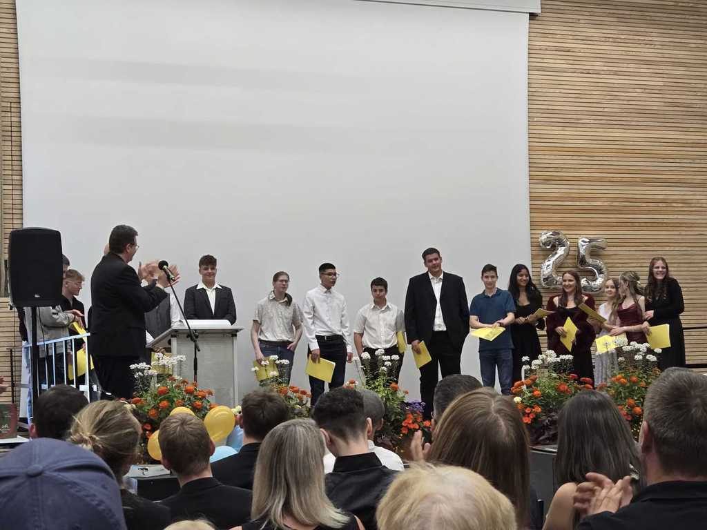Mit einem Gesamtdurchschnitt von 2,8 erzielte der Jahrgang ein gutes Ergebnis. Schulbester Schüler war Kevin Fernandes Dias. Für seine guten Leistungen wurde er mit dem Preis der Gemeinde ausgezeichnet. Dieser ist neben einer Urkunde auch mit einem Geldpreis verbunden und wurde vom Bürgermeister feierlich überreicht.